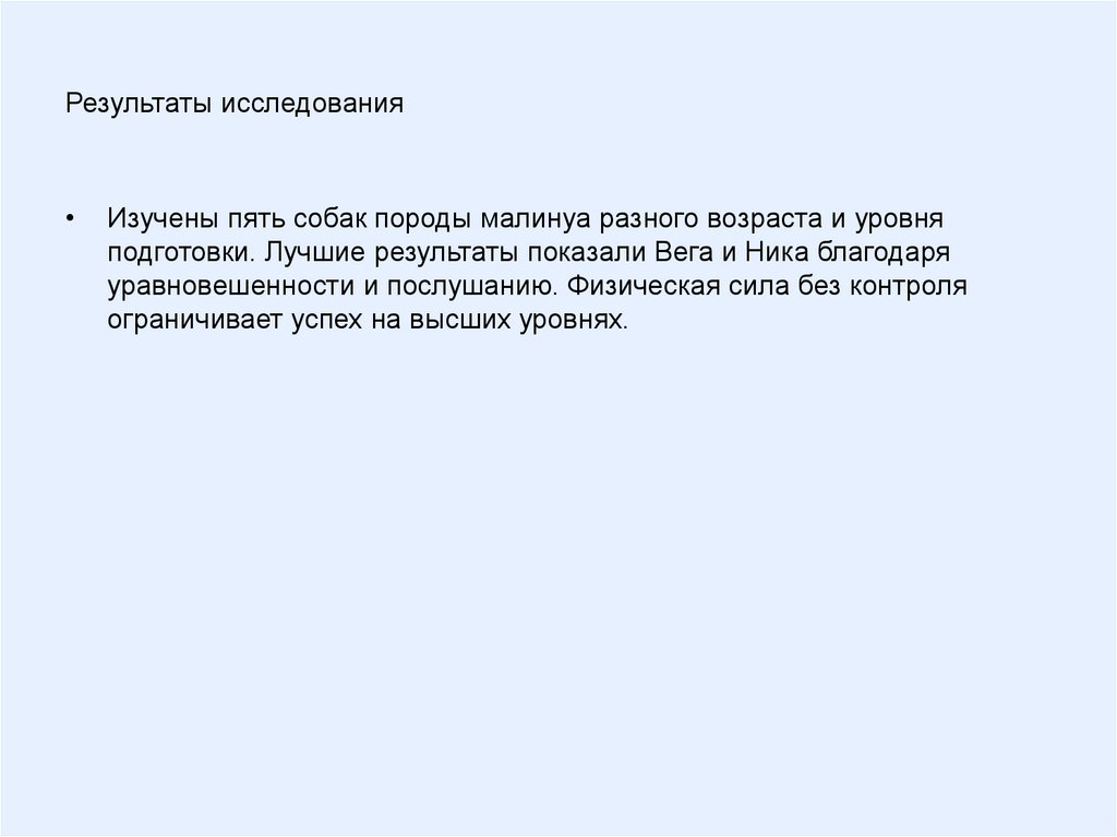 Результаты исследованияИзучены пять собак породы малинуа разного возраста и уровня