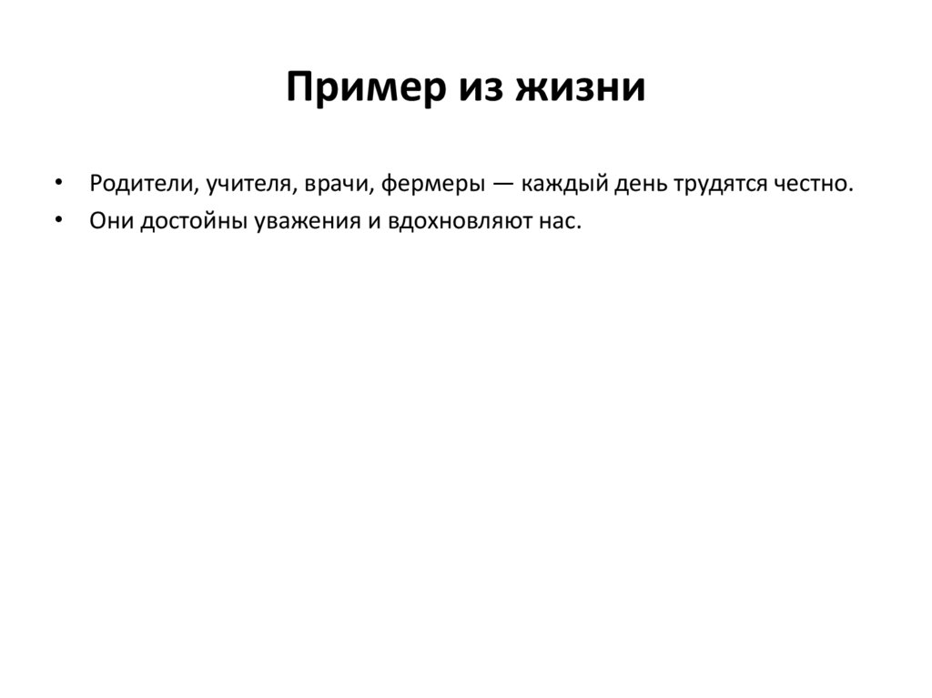 Пример из жизни• Родители, учителя, врачи, фермеры — каждый день трудятся честно.