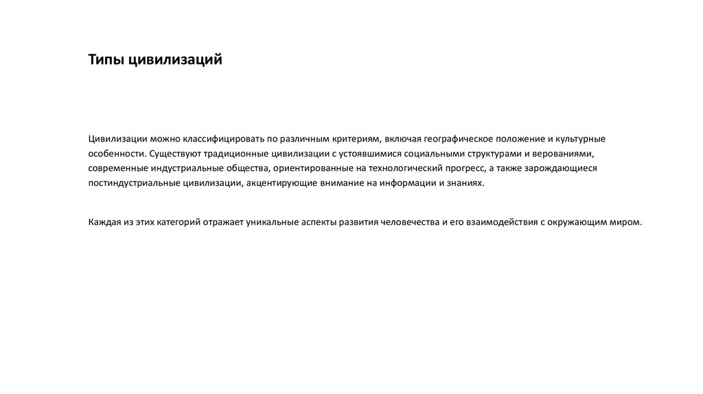 Типы цивилизацийЦивилизации можно классифицировать по различным критериям, включая географическое положение и культурные