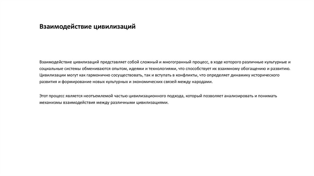 Взаимодействие цивилизацийВзаимодействие цивилизаций представляет собой сложный и многогранный процесс, в ходе которого различные культурные и