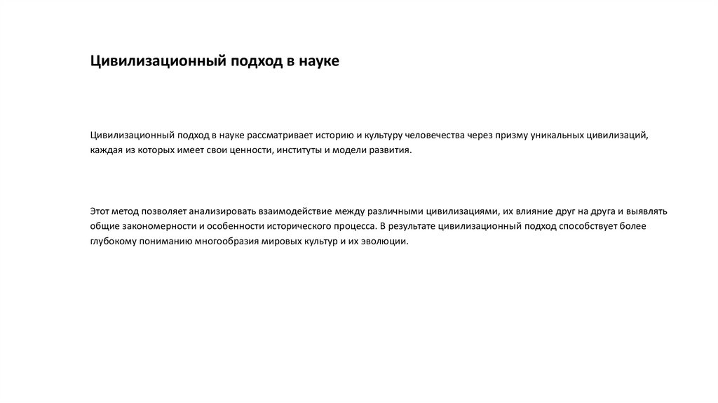 Цивилизационный подход в наукеЦивилизационный подход в науке рассматривает историю и культуру человечества через призму уникальных цивилизаций,