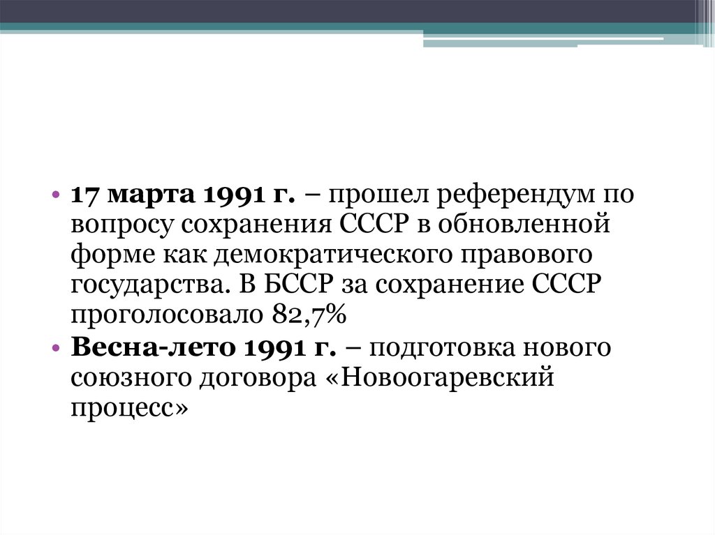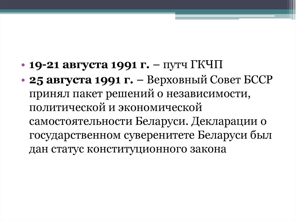 • 19-21 августа 1991 г. – путч ГКЧП• 25 августа 1991 г. – Верховный Совет БССР