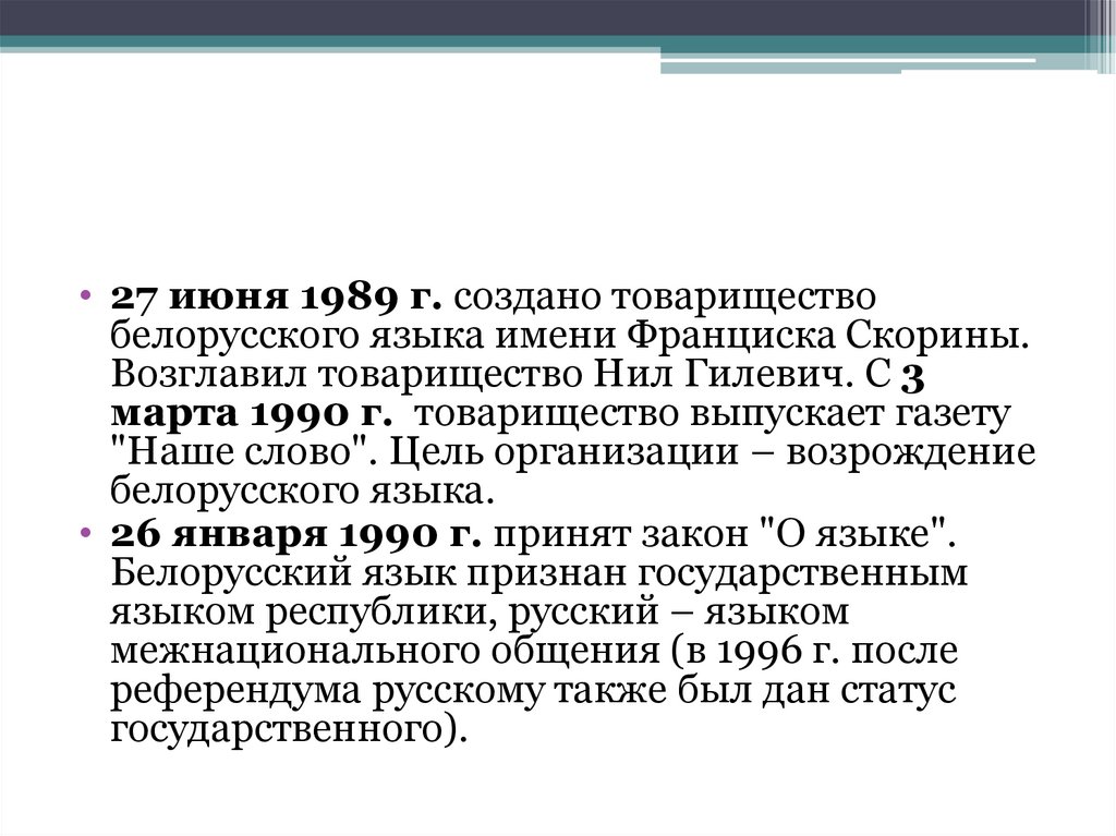 • 27 июня 1989 г. создано товариществобелорусского языка имени Франциска Скорины.
