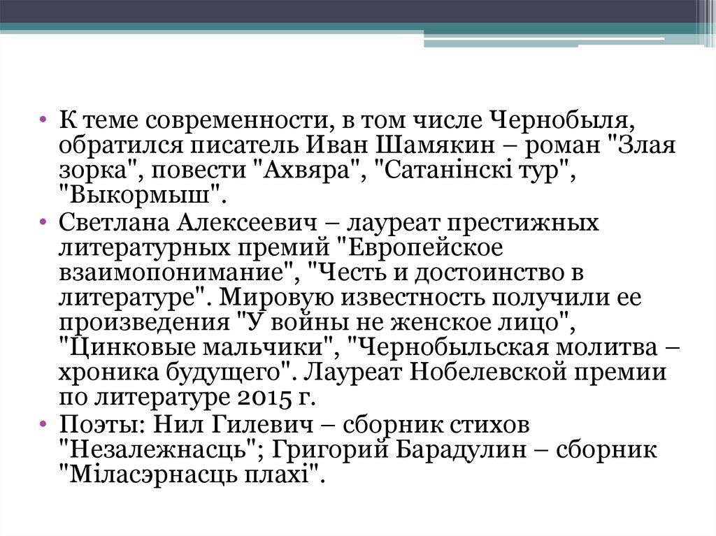 • К теме современности, в том числе Чернобыля,обратился писатель Иван Шамякин – роман "Злая