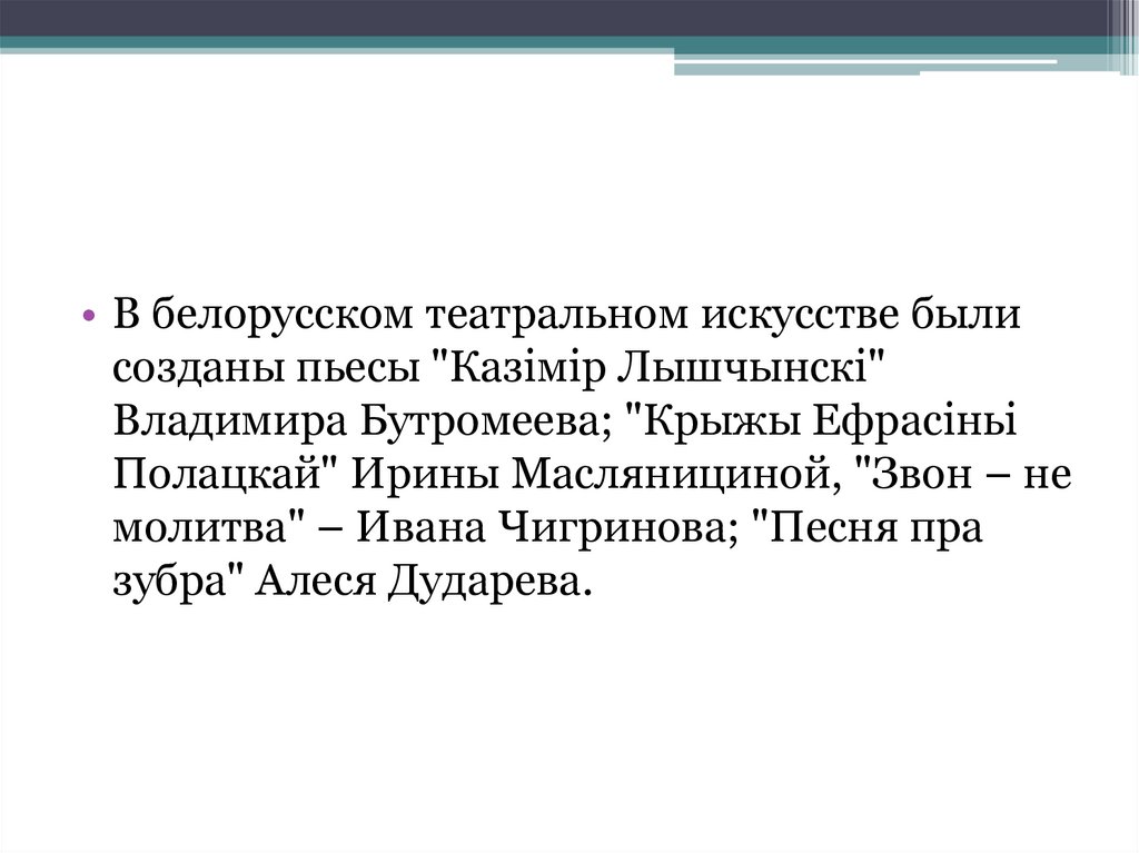 • В белорусском театральном искусстве былисозданы пьесы "Казiмiр Лышчынскi"