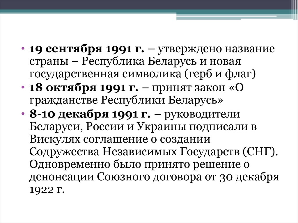 • 19 сентября 1991 г. – утверждено названиестраны – Республика Беларусь и новая