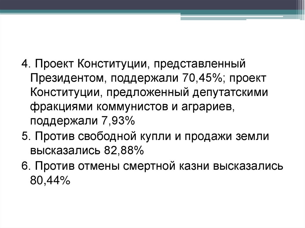 4. Проект Конституции, представленныйПрезидентом, поддержали 70,45%; проект