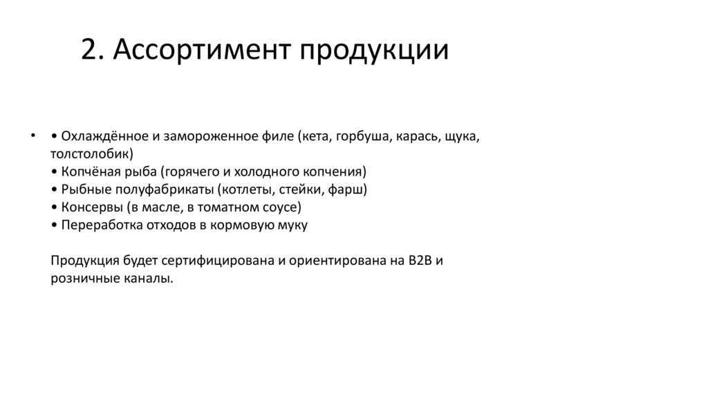 2. Ассортимент продукции• • Охлаждённое и замороженное филе (кета, горбуша, карась, щука,
