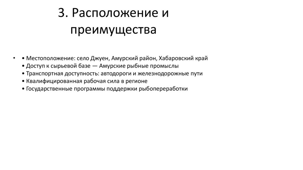1. Резюме проекта• Цель: Создание современного завода по переработке рыбы в селе