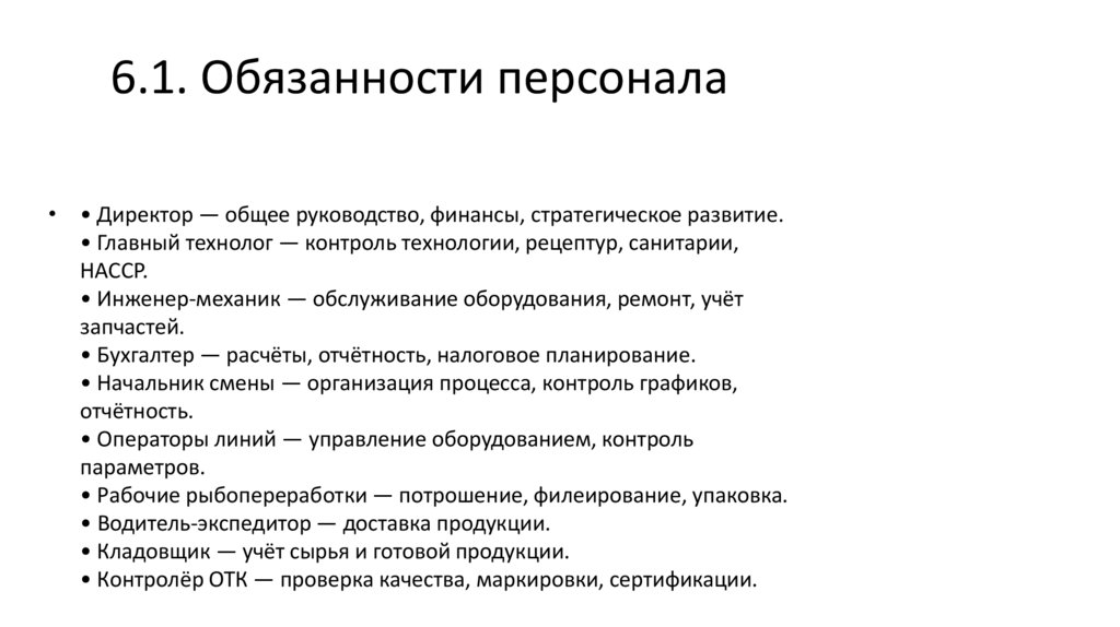 6.1. Обязанности персонала• • Директор — общее руководство, финансы, стратегическое развитие.