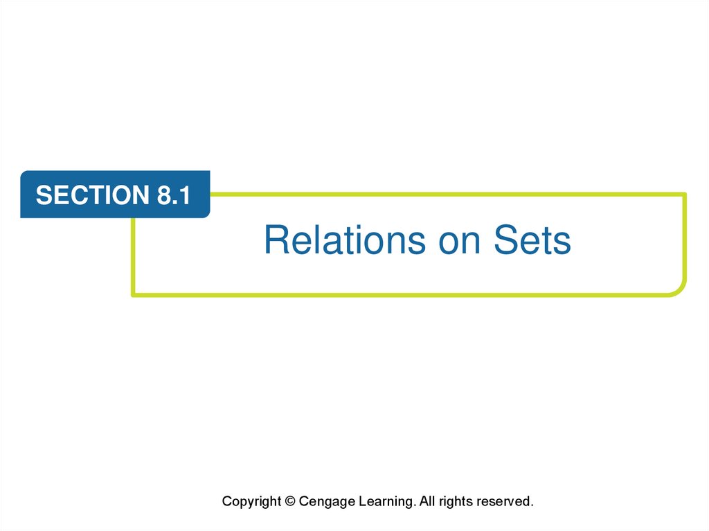 Let A and B be two sets. By a relation R from A to B wemean a subset of A × B. That is, R is a set of ordered pairs,