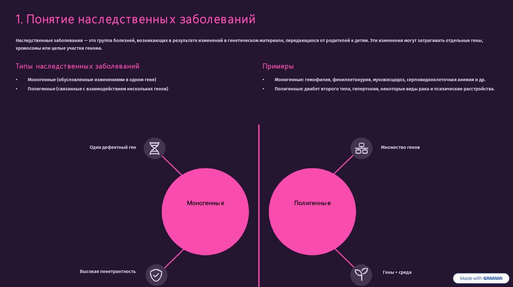 1. Понятие наследственны х заболеванийНаследственные заболевания — это группа болезней, возникающих в результате изменений в генетическом материале, передающихся от родителей к детям. Эти изменения могут затрагивать отдельные гены,
