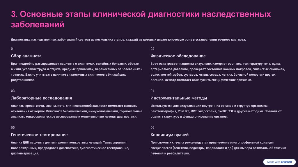обследование, лабораторные и инструментальные исследования, генетическое тестирование и междисциплинарное взаимодействие специалистов. Современная