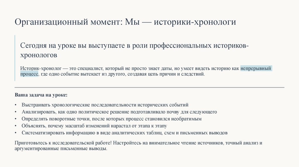 Организационный момент: Мы — историки-хронологиСегодня на уроке вы выступаете в роли профессиональных историковхронологов