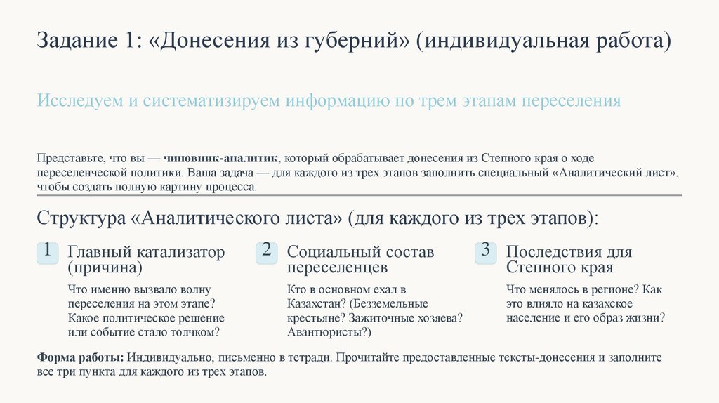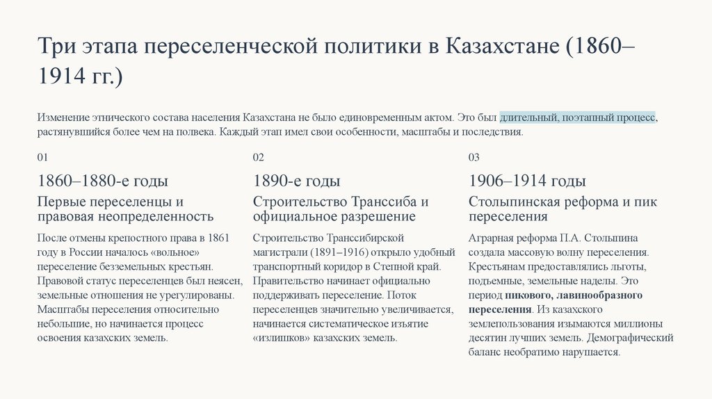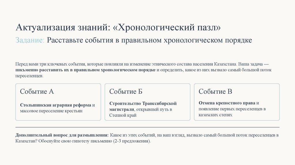 Перед вами три ключевых события, которые повлияли на изменение этнического состава населения Казахстана. Ваша задача —
