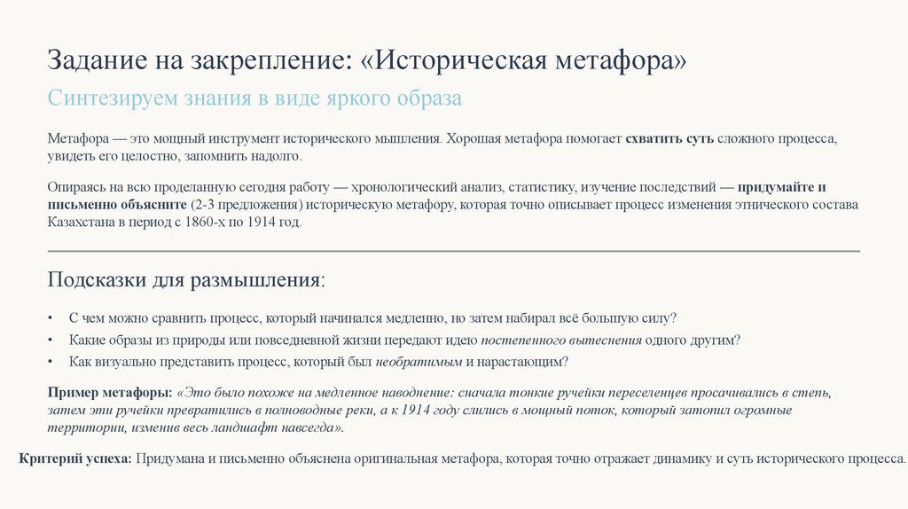 Критерий успеха: Придумана и письменно объяснена оригинальная метафора, которая точно отражает динамику и суть исторического процесса.