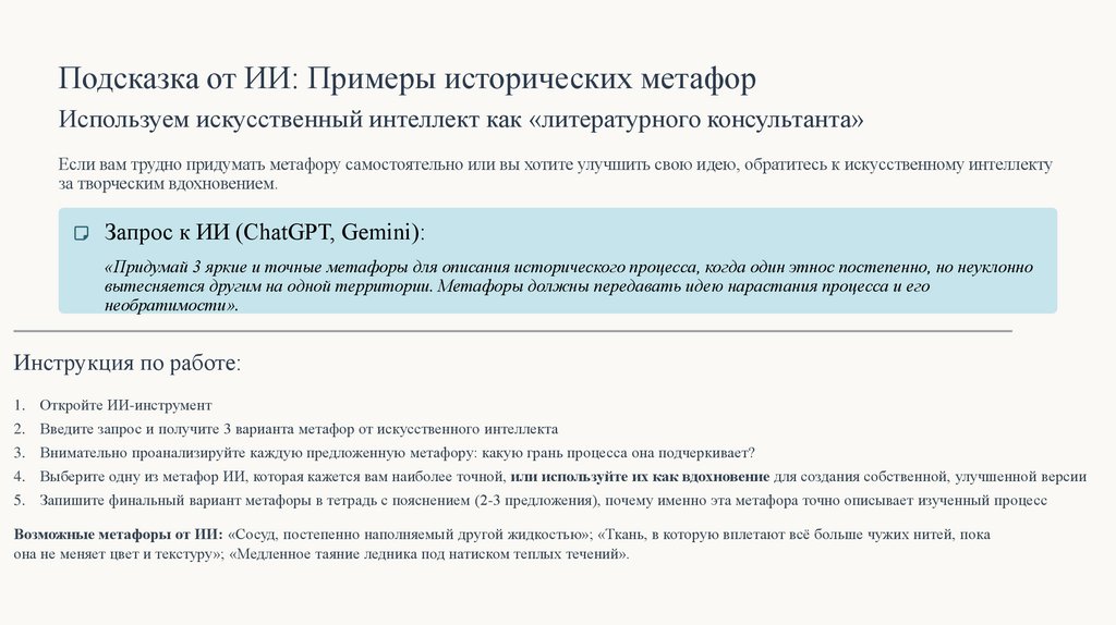 Подсказка от ИИ: Примеры исторических метафорИспользуем искусственный интеллект как «литературного консультанта»