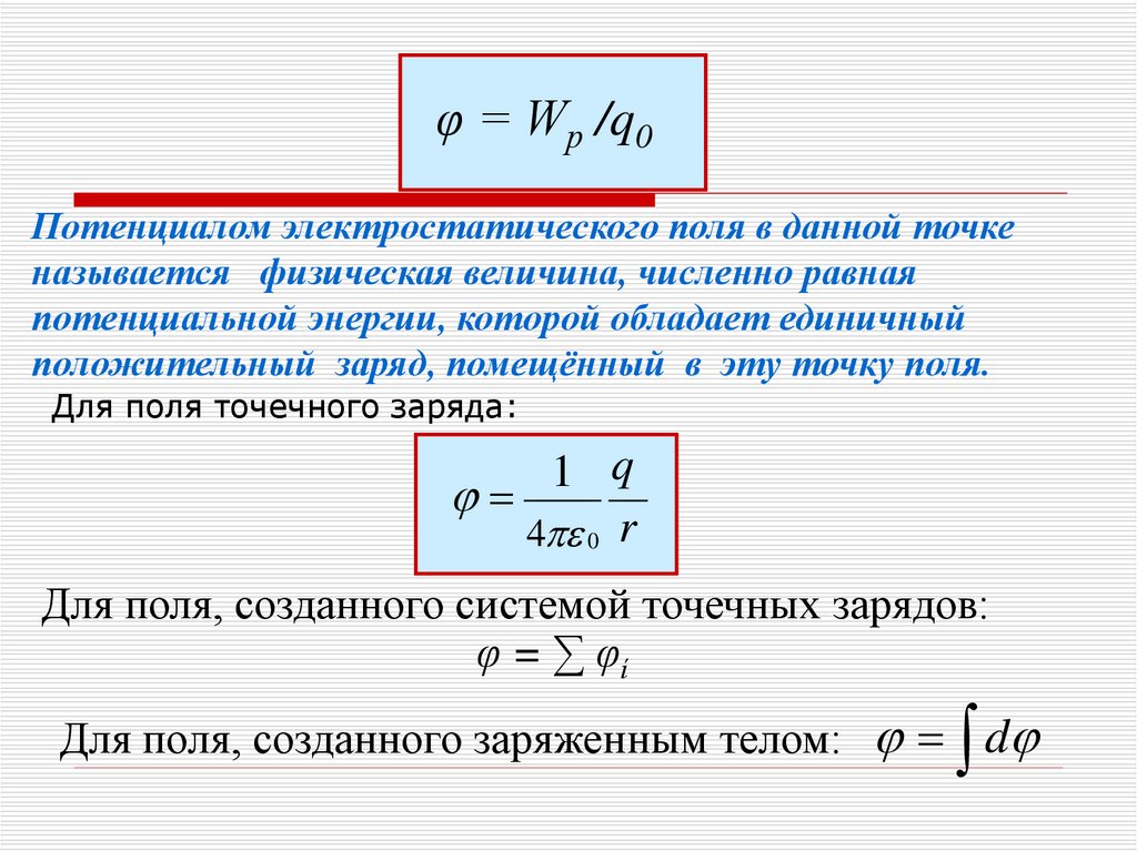φ = Wр /q0Потенциалом электростатического поля в данной точке