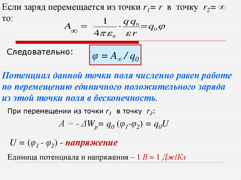 Если заряд перемещается из точки r1= r в точку r2= ∞то: