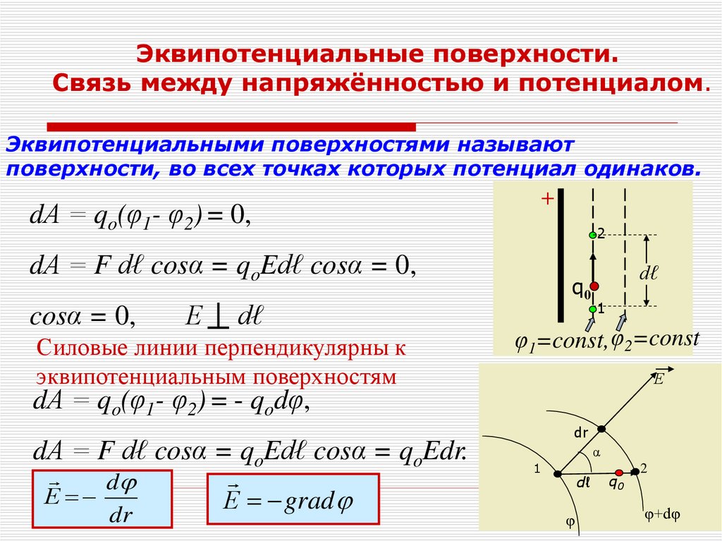 Эквипотенциальные поверхности.Связь между напряжённостью и потенциалом.