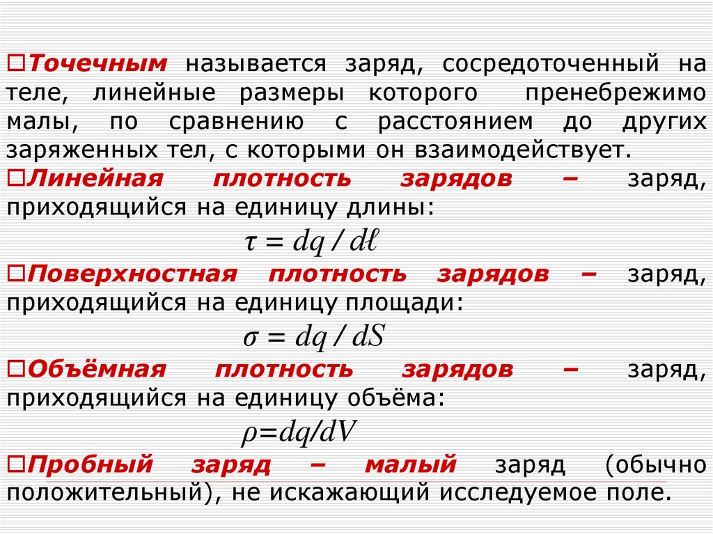 Точечным называется заряд, сосредоточенный нателе, линейные размеры которого