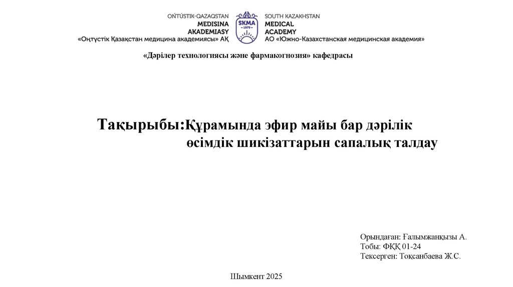 «Дәрілер технологиясы және фармакогнозия» кафедрасыТақырыбы:Құрамында эфир майы бар дәрілік