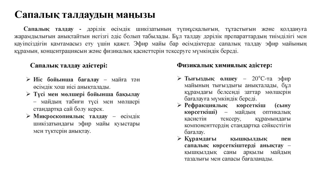 түпнұсқалығын, эфир майының бар-жоғын және сапасын анықтауға бағытталған. Мұндай талдау