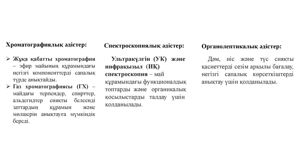 Хроматографиялық әдістер:Спектроскопиялық әдістер:
