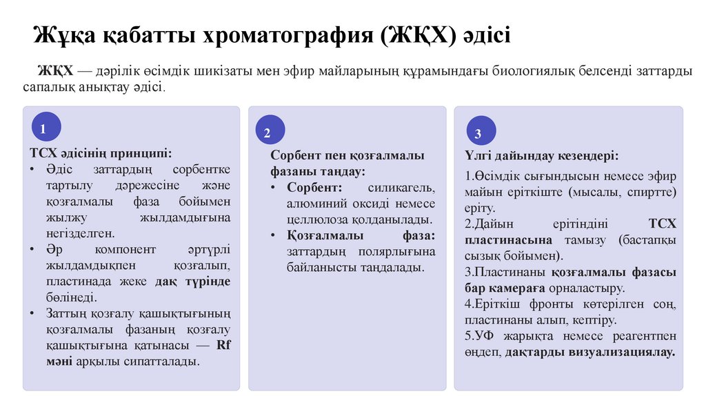 Жұқа қабатты хроматография (ЖҚХ) әдісіЖҚХ — дәрілік өсімдік шикізаты мен эфир майларының құрамындағы биологиялық белсенді заттарды