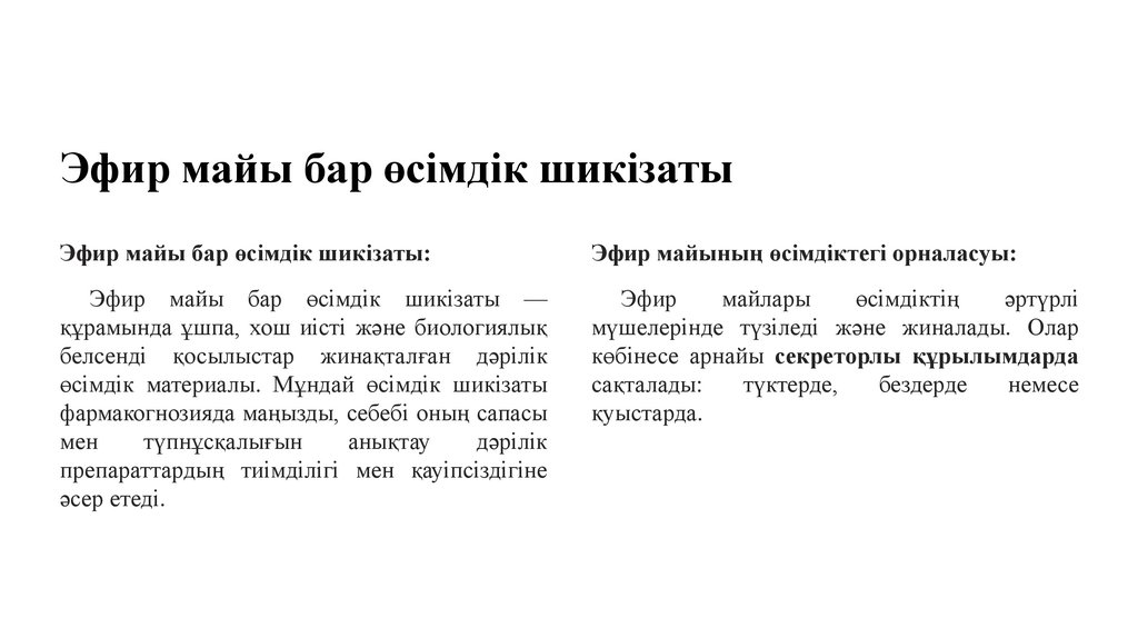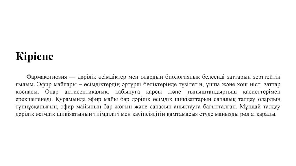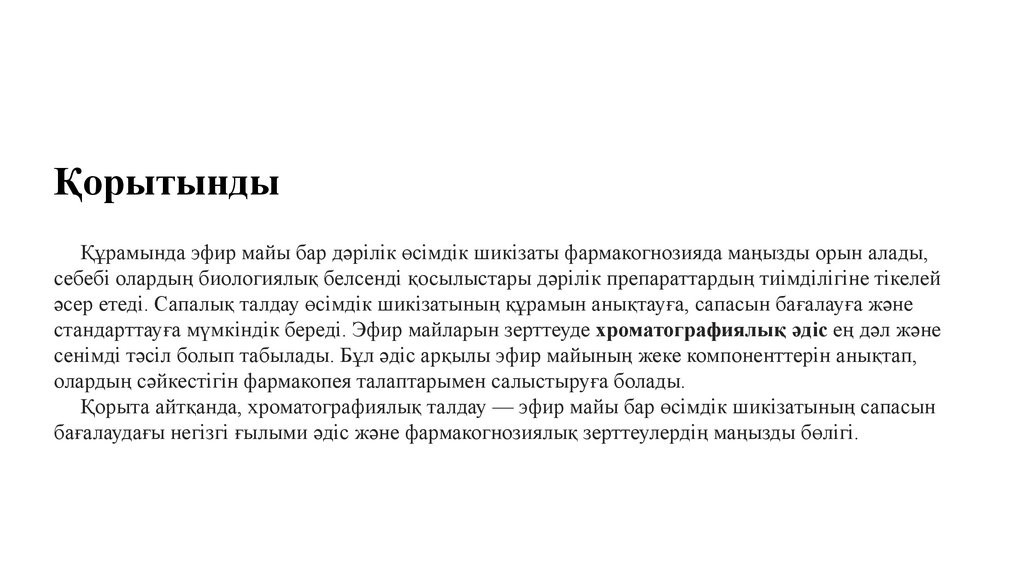 ҚорытындыҚұрамында эфир майы бар дәрілік өсімдік шикізаты фармакогнозияда маңызды орын алады,