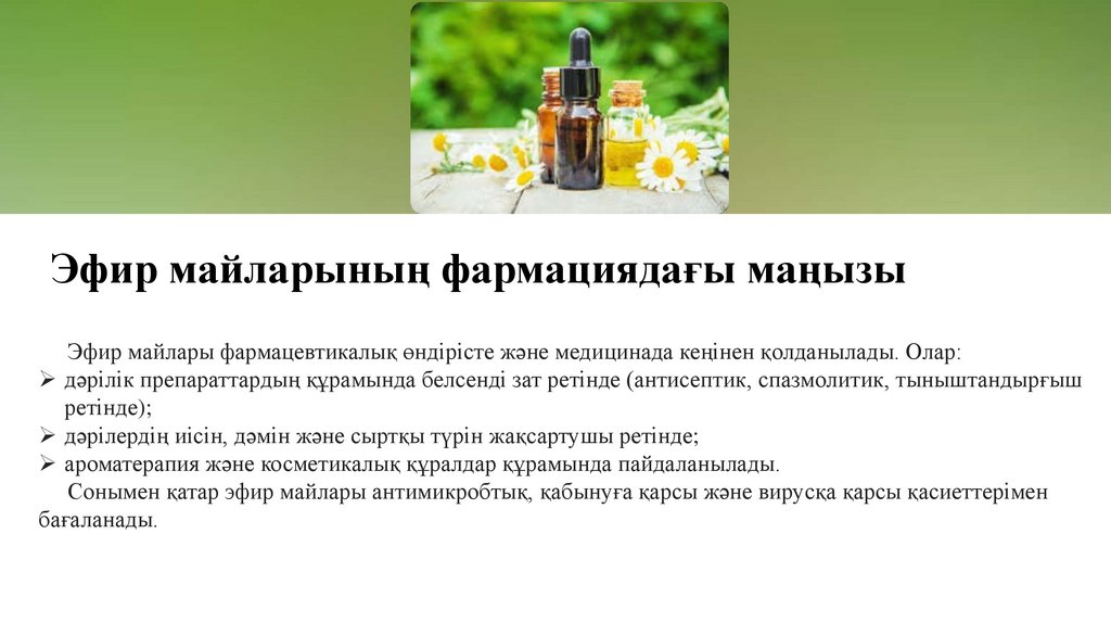 Эфир майларының фармациядағы маңызыЭфир майлары фармацевтикалық өндірісте және медицинада кеңінен қолданылады. Олар: