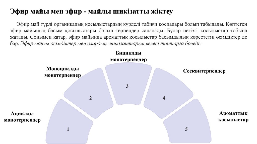 Эфир майы мен эфир - майлы шикізатты жіктеуЭфир май түрлі органикалық қосылыстардың күрделі табиғи қоспалары болып табылады. Көптеген