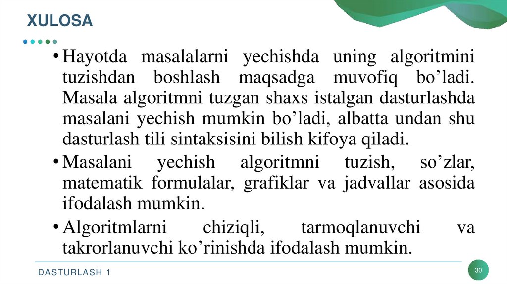 XULOSA• Hayotda masalalarni yechishda uning algoritmini