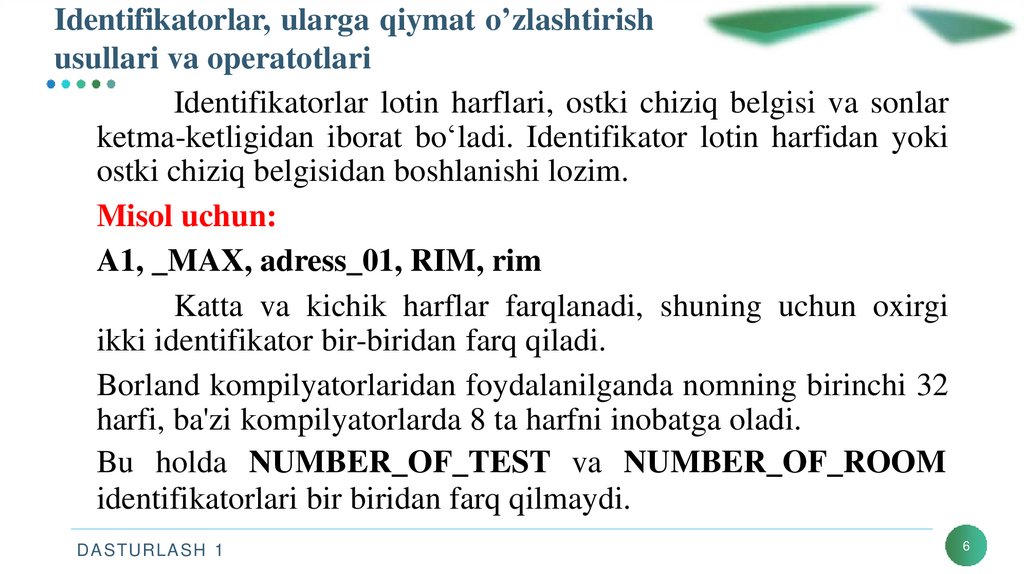 Identifikatorlar, ularga qiymat o’zlashtirishusullari va operatotlari