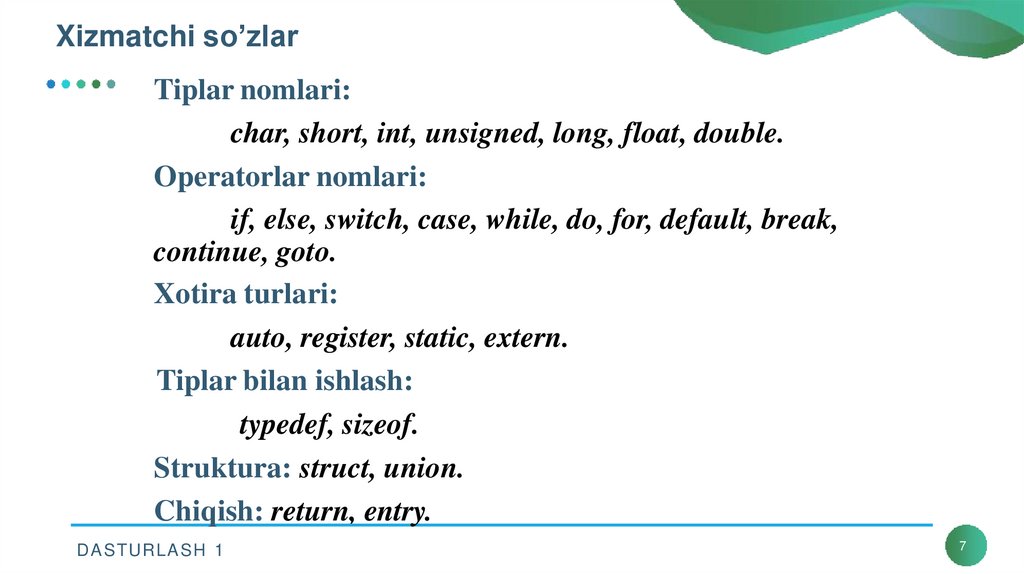 6. #include <stdlib.h> - standart kutubxona fayllarini chaqirish