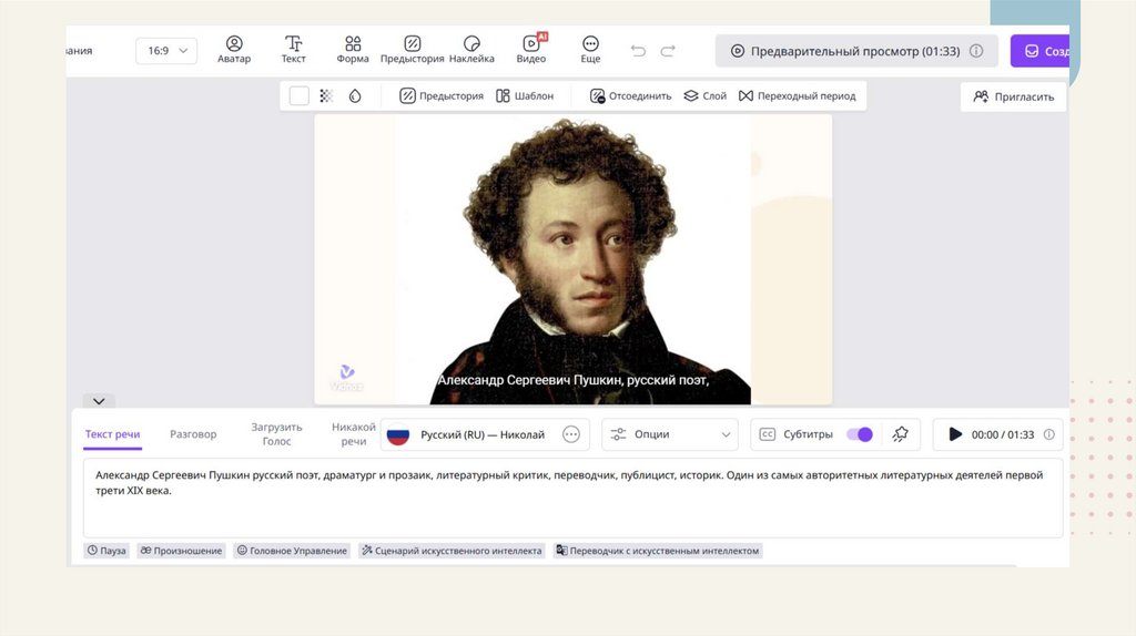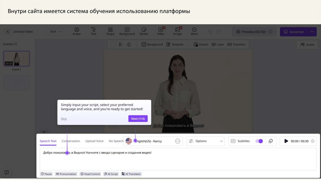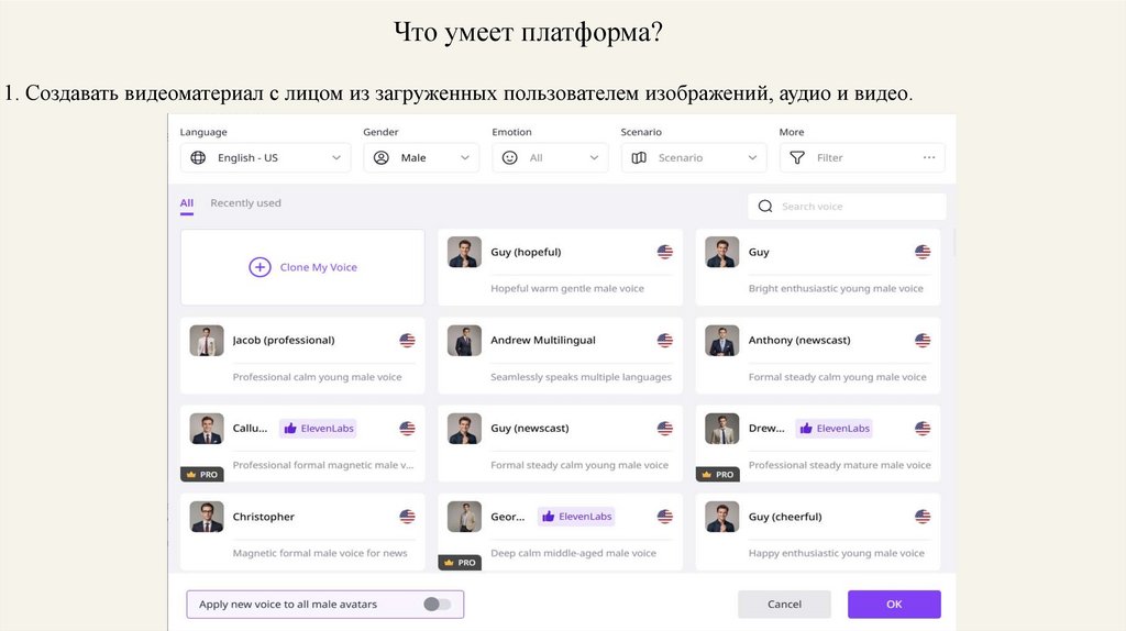 1. Создавать видеоматериал с лицом из загруженных пользователем изображений, аудио и видео.