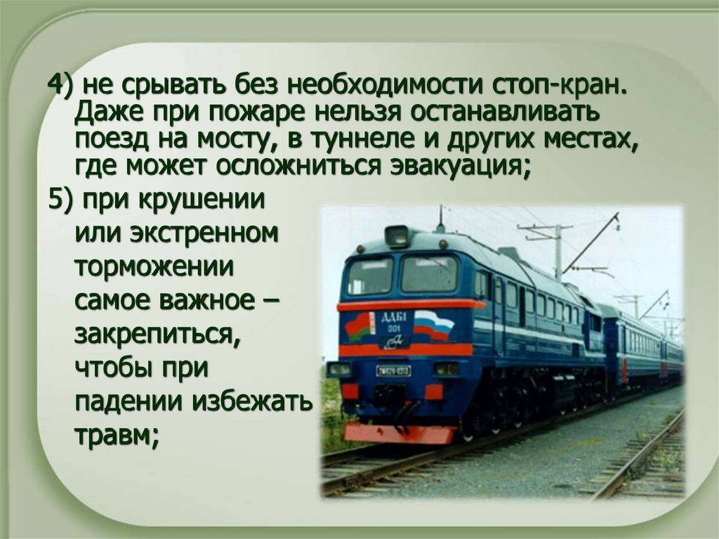 4) не срывать без необходимости стоп-кран.Даже при пожаре нельзя останавливать