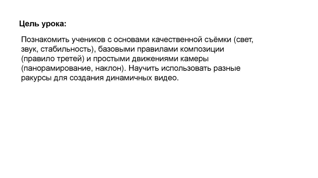 Цель урока:Познакомить учеников с основами качественной съёмки (свет,