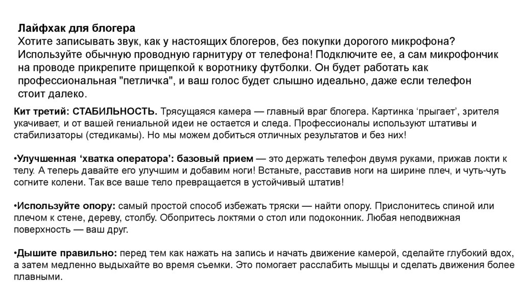 •Дышите правильно: перед тем как нажать на запись и начать движение камерой, сделайте глубокий вдох,