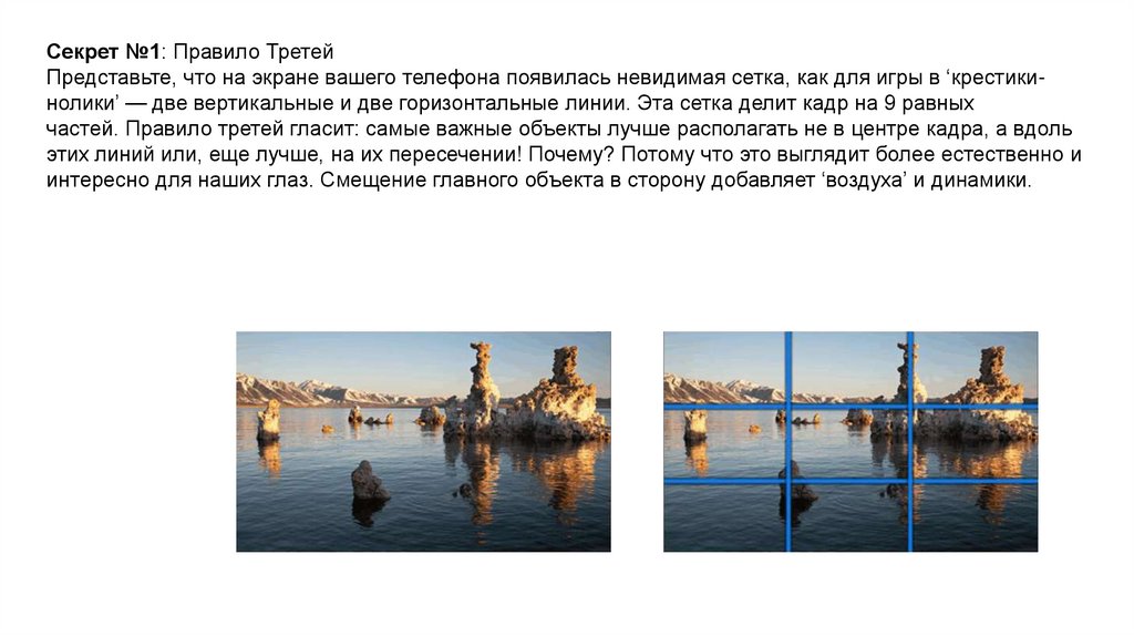 Секрет №1: Правило ТретейПредставьте, что на экране вашего телефона появилась невидимая сетка, как для игры в ‘крестикинолики’ — две вертикальные и две горизонтальные линии. Эта сетка делит кадр на 9 равных