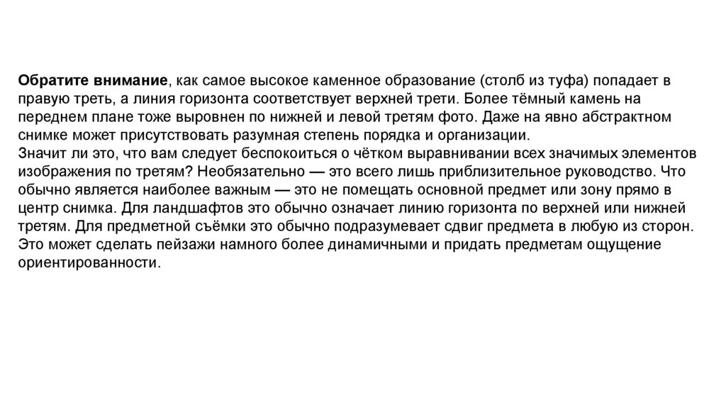 Обратите внимание, как самое высокое каменное образование (столб из туфа) попадает вправую треть, а линия горизонта соответствует верхней трети. Более тёмный камень на