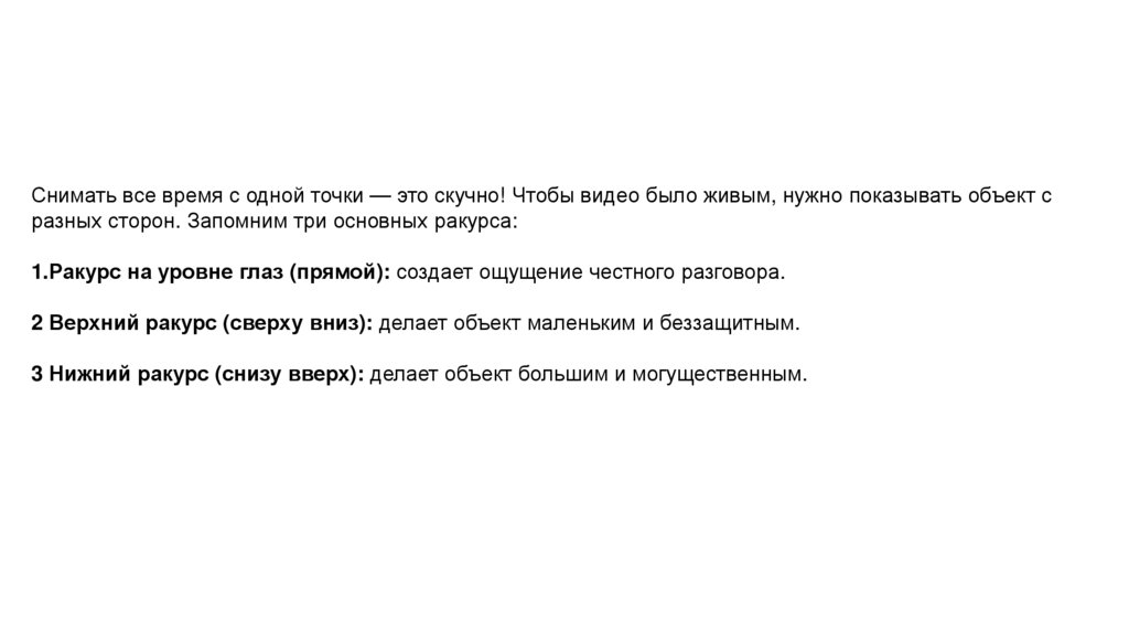 Снимать все время с одной точки — это скучно! Чтобы видео было живым, нужно показывать объект сразных сторон. Запомним три основных ракурса: