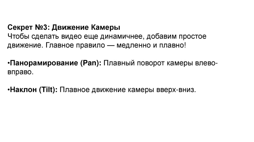 •Наклон (Tilt): Плавное движение камеры вверх-вниз.