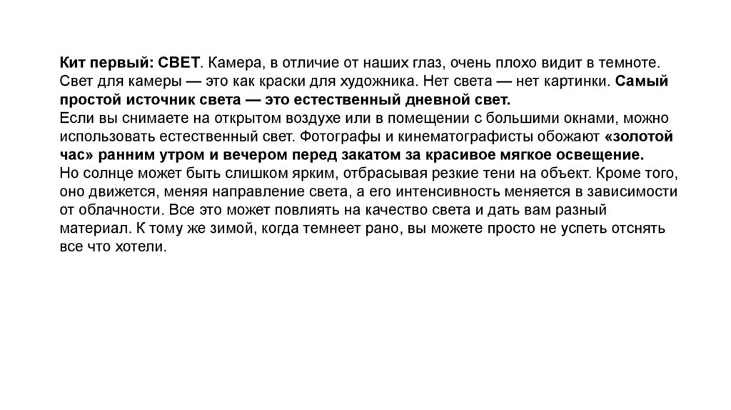 Кит первый: СВЕТ. Камера, в отличие от наших глаз, очень плохо видит в темноте.Свет для камеры — это как краски для художника. Нет света — нет картинки. Самый