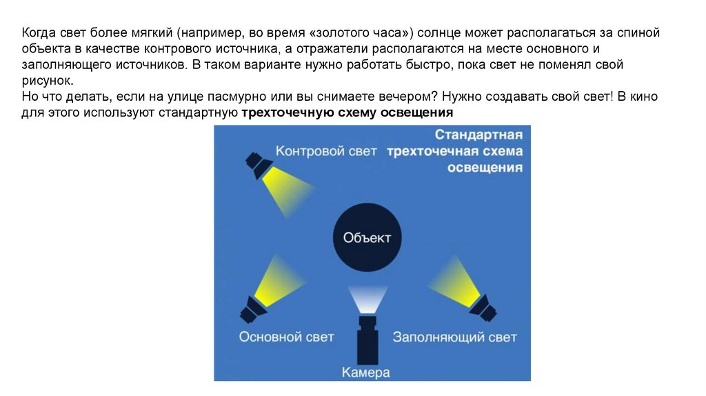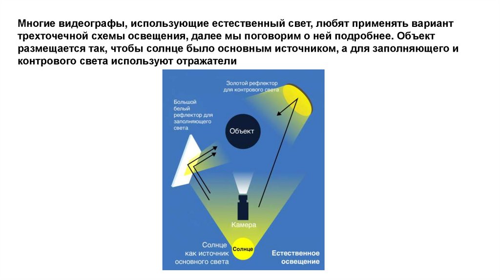 Многие видеографы, использующие естественный свет, любят применять варианттрехточечной схемы освещения, далее мы поговорим о ней подробнее. Объект