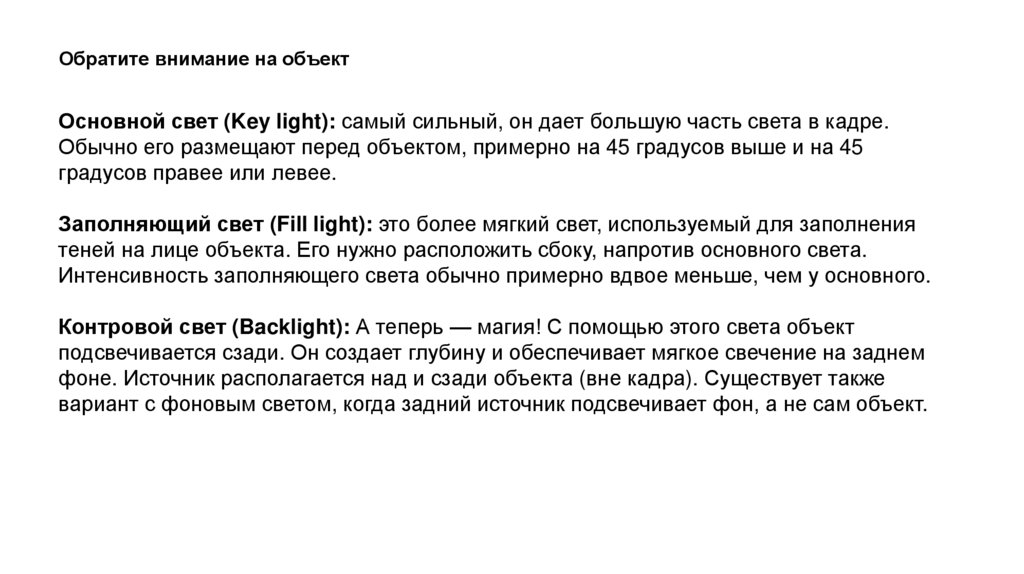 Обратите внимание на объектОсновной свет (Key light): самый сильный, он дает большую часть света в кадре.