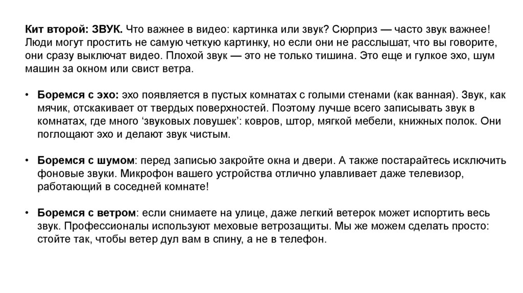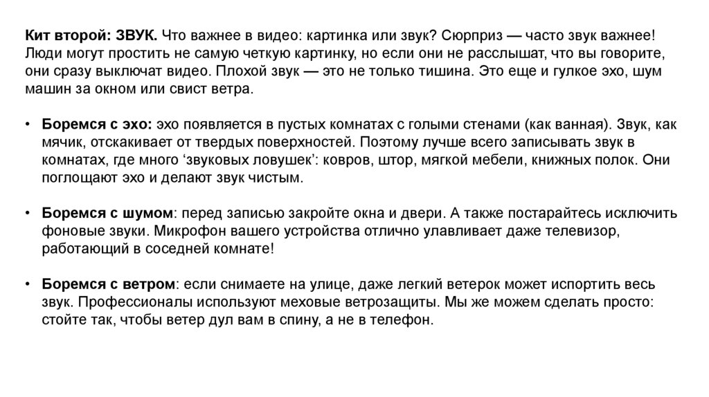 Кит второй: ЗВУК. Что важнее в видео: картинка или звук? Сюрприз — часто звук важнее!Люди могут простить не самую четкую картинку, но если они не расслышат, что вы говорите,