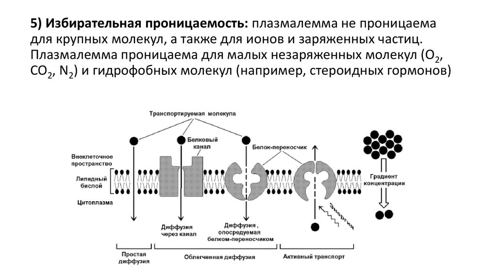 • Транспортную функцию мембраны (транспорту гидрофильных веществ препятствует сплошной липидный бислой,