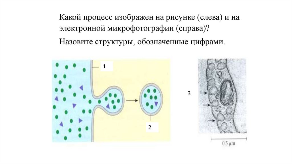 Какой процесс изображен на рисунке (слева) ина электронной микрофотографии (справа)?