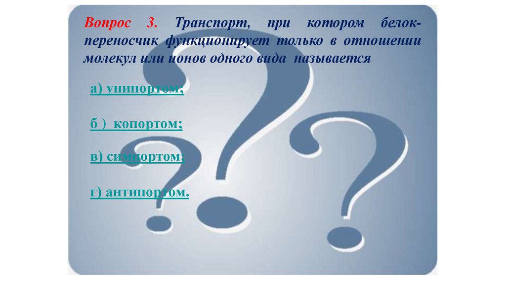 Вопрос 3. Транспорт, при котором белокпереносчик функционирует только в отношениимолекул или ионов одного вида называется